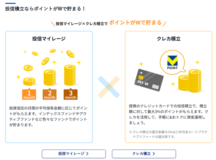 SBI証券は三井住友カードと提携しており、カードで投資信託の積み立てるとポイントが貯まります。