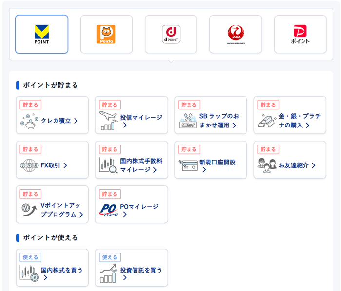 SBI証券では、画像の通り5つのポイントサービスでポイントが貯まり、2つのポイントサービスのポイントが使えます。