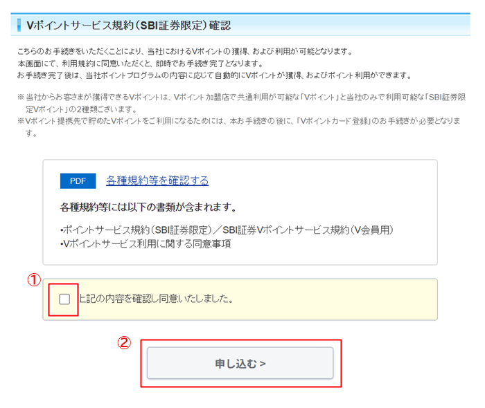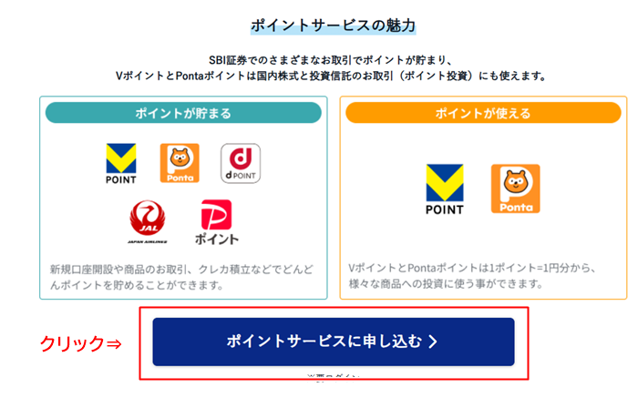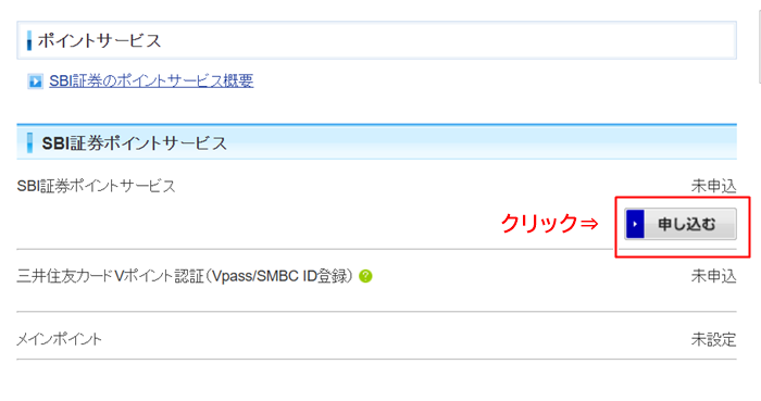 SBI証券ポイントサービスの「申し込む」、をクリック