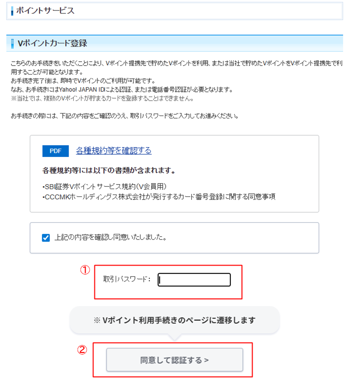 ①取引パスワードを入力>②同意して認証する>、をクリック