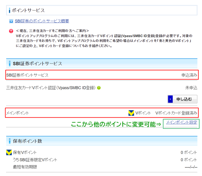「メインポイントの設定」から他のポイントに切り替えられます。